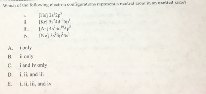 Which of the following electron configurations of neutral atoms represent excited states. This is the upper energy state and is termed as the unstable state. The following electron configurations represent excited states.